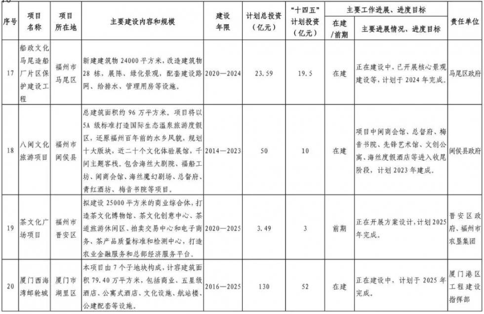 船政文化马尾造船厂片区保护建设工程,新建建筑物24000平方米,改造建筑物28栋,建设展陈、绿化景观,配套建设路网、给排水、管理用房等设施,计划总投资23.59亿元。项目正在建设中,计划2024年完成。