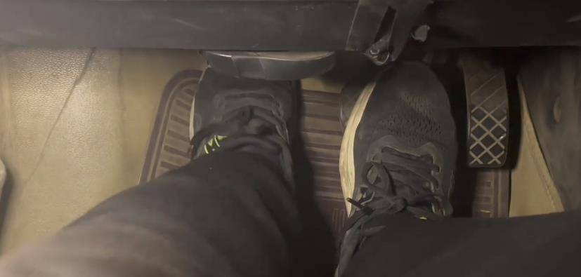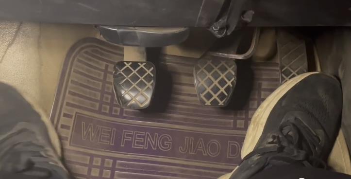 第1种情况,脚跟放到油门的后面,右脚正着去踩油门