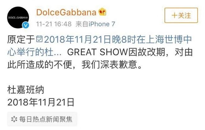 嘉宾、模特、工作人员全都没了,还办什么活动?没过多久,文旅部下达通知取消D&G上海大秀活动,杜嘉班纳官博也宣布今晚的活动因故改期,只字不提设计师辱华。