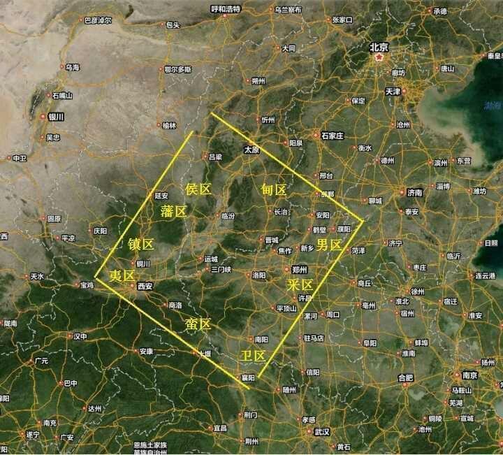 朝王畿方千里,注意北角指向石峁遗址,西角是岐山,周朝发家以前的首都