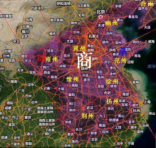 用量天尺实地测算出的王畿和九州(以蓝色线为准,当时连云港还是海),根据考古,商朝领地有:王畿(冀州)商都安阳市殷墟遗址、西鄙晋中市旌介遗址(霍国)、北鄙定州市北庄子遗址(《史记吴起》常山)、东鄙济南大辛庄遗址、南鄙焦作府城遗址和郑州市遗址,(兖州)青州市苏埠屯遗址,(徐州)枣庄市滕州前掌大遗址,(豫州)信阳市天湖遗址,(雍州)西安市老牛坡遗址,分布地域北到北京西南、东到济南东、南到合肥南京之间(扬州)、西到关中,涉及今北京、河北、山东、山西、河南、陕西、安徽七省市,再加上商朝原始文化的东北系如山戎令支国(幽州)、孤竹国(营州)一系列遗址以及武汉市盘龙城遗址(昆吾)、清江县吴城和新干县大洋洲遗址(荆州),就是图里的九州所在。也可以看出商朝的重心在哪些州。而对武丁大墓出土青铜盔放射分析,其铜产地是云贵交界处,也就是四川广汉三星堆区域。