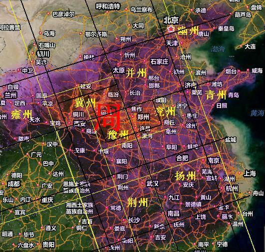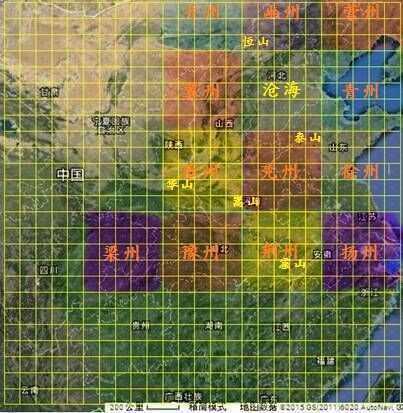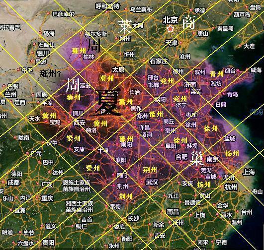 夏商周的九州是以经纬划分的,只是用的是斜着的经纬,因为北极星四五千年前在西北,夏朝以250米为里、商朝以400米为里、周朝以440米为里,于是各自的框框都不一样