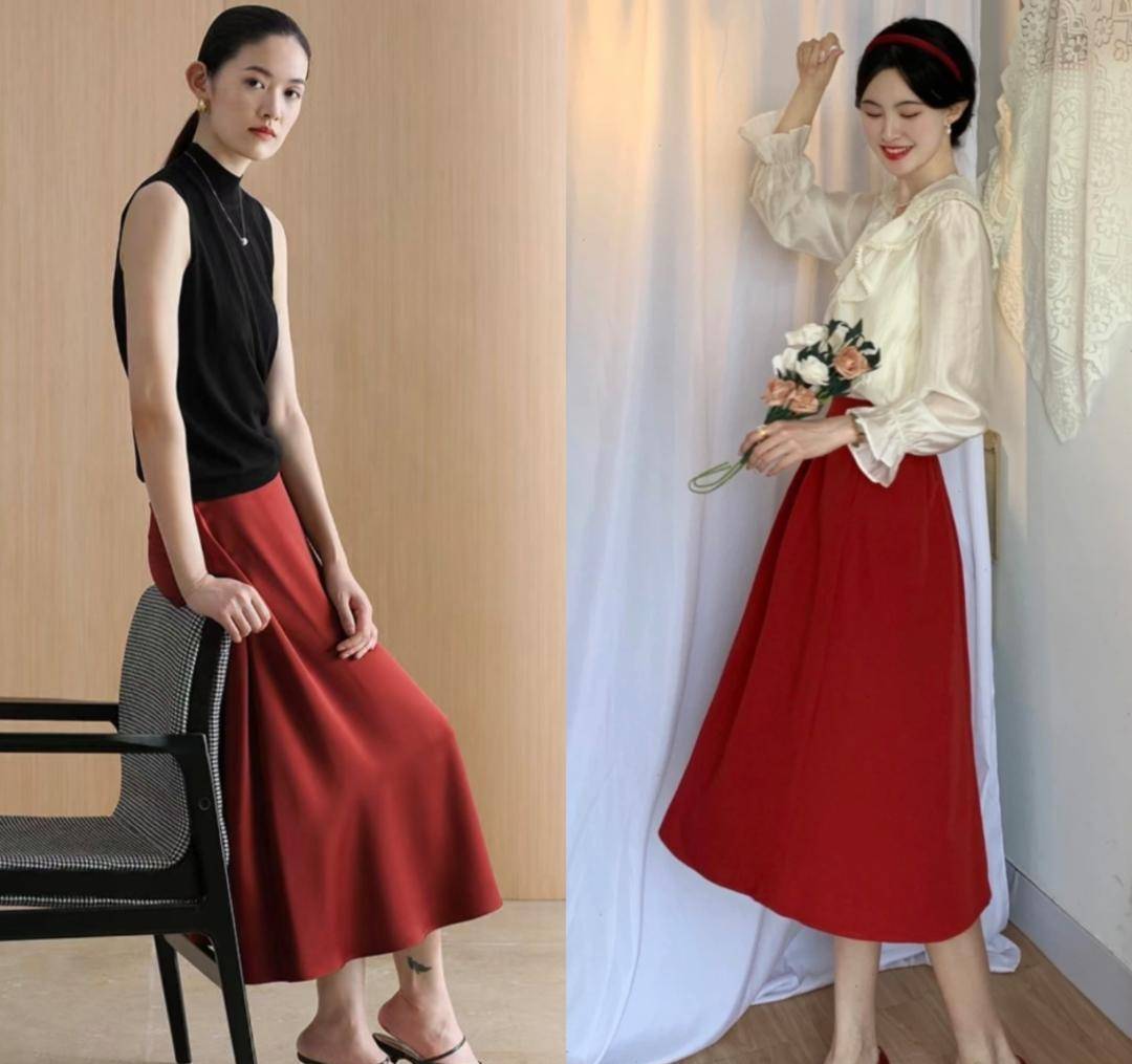 红色裙子与白色或黑色上衣搭配,可以更具表现力,展现时尚和自信。
