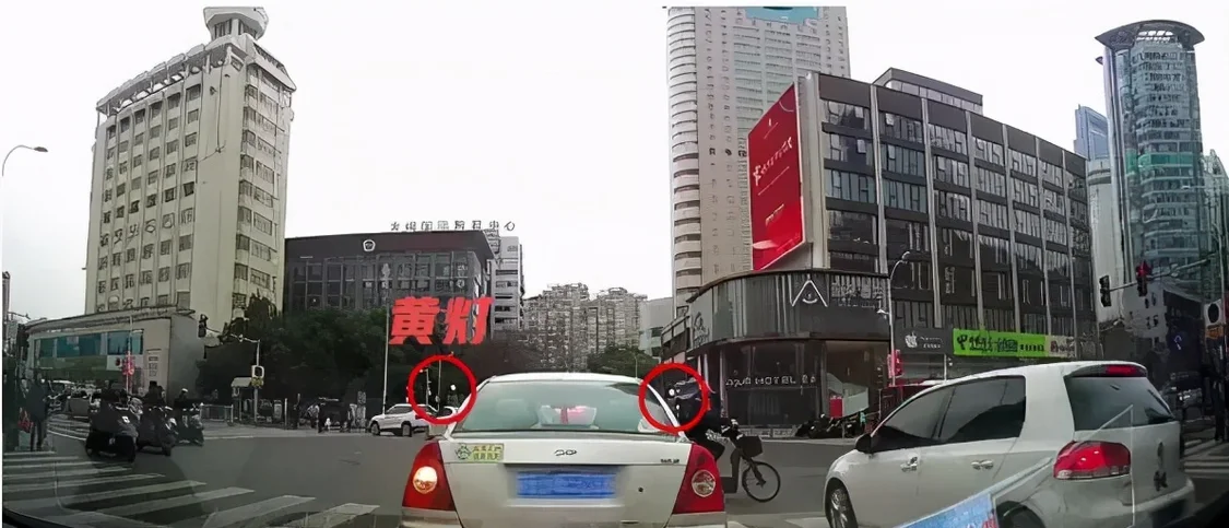 可以看到,黄灯亮起时的车身位置是决定是否闯黄灯的关键。