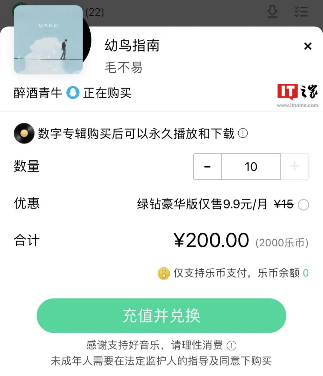 ( IT之家 )据 Tech 星球消息,近日有网友发现 QQ 音乐专辑购买数量取消了限制,用户可重复购买已购专辑或单曲,购买上限为 10 张(首)。