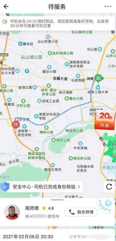 据家属提供的事发当晚的货拉拉订单截图,红星新闻记者看到,车莎莎呼叫的是一辆车牌号为湘A·DA6XXX的面包车,司机周师傅显示的平台分数为4.8分,订单显示司机将于事发当晚(2月6日)20:30准时到达。