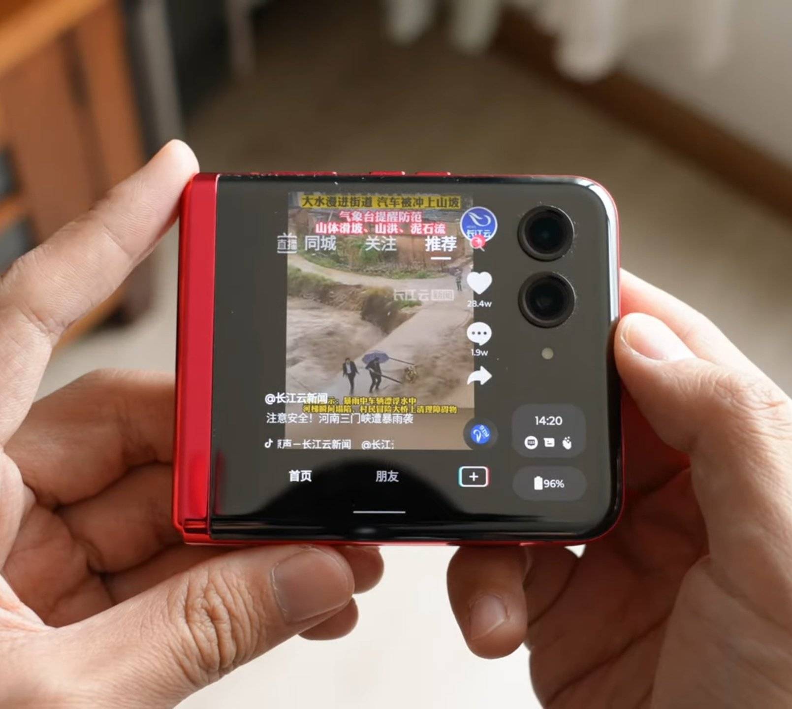 因为外屏增大至3.6英寸,超过了iPhone 4 3.5英寸这种的直板机,尺寸的增大也让操作起来更方便了:下滑查看控制中心、左下角可以直接进入“通知中心”、查看“剩余电量”。外屏桌面适配了“今日头条”、“地图类”、抖音、腾讯系的大量App。