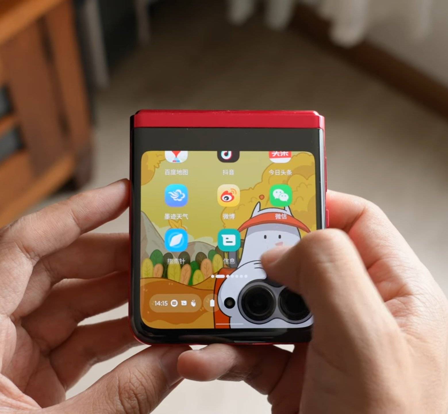 软件体验:moto 的刀锋系列折叠屏进化到第四代,在这一代官方似乎在悄悄地转变风格,从硬朗商务风开始转向,增加女性审美元素,锁屏毕竟有做优化,“钟文泽”就Po出了这个专为背部双摄(1300+1200,非凑数)而定制的壁纸,官方还做了一系列的“摩儿”壁纸。