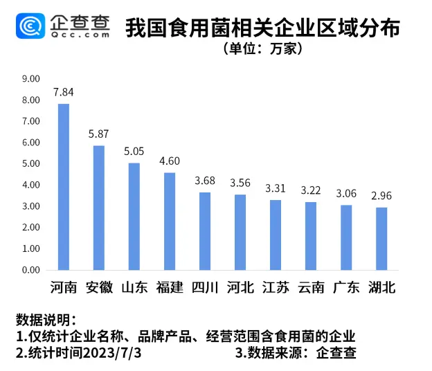 企查查数据显示,从区域分布来看,河南以7.84万家食用菌相关企业位居第一。安徽、山东分别有5.87万家、5.05万家食用菌相关企业,位居前三。此后依次为福建、四川、河北等地。