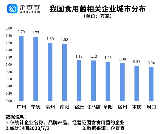 企查查数据显示,从城市分布来看,广州以1.79万家食用菌相关企业位居首位。宁德、亳州分别有食用菌相关企业1.77万家、1.60万家,排名前三。此后依次为南阳、宿迁、驻马店等地。