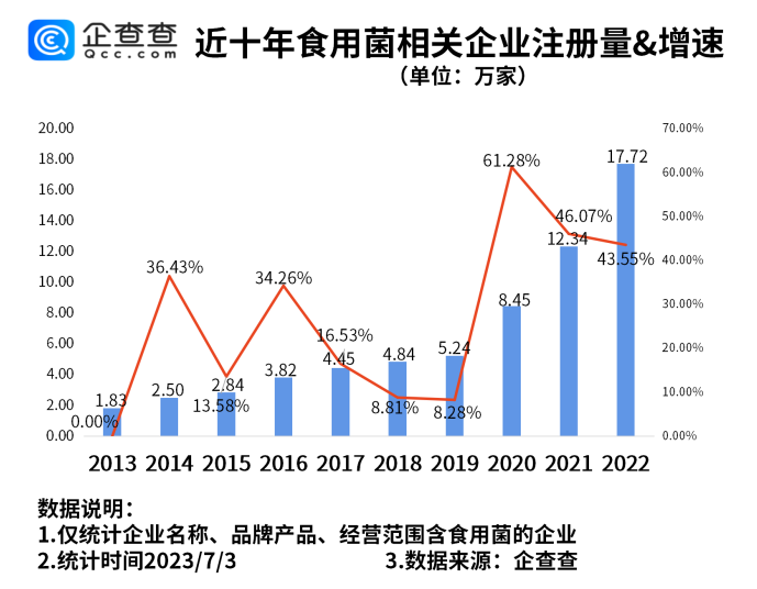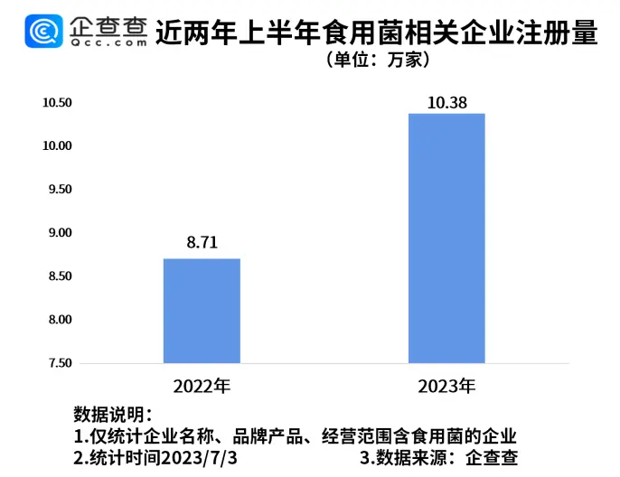 企查查数据显示,2023年上半年,我国新增食用菌相关企业10.38万家,与2022年上半年相比,同比增加19.21%。