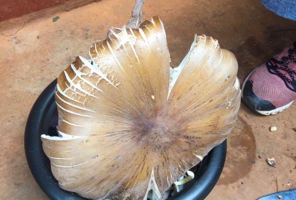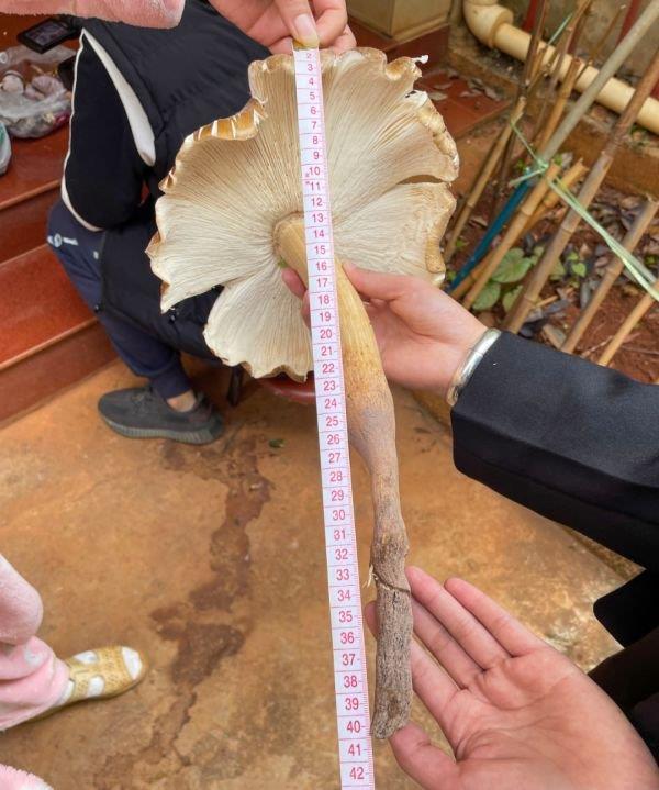 在王先生家中记者看到,一朵体型远超过正常菌类的巨型鸡枞菌正摆放在记者眼前,巨型鸡枞菌长约40厘米,菌盖宽为30厘米。菌杆细长,菌盖开展如伞,边部辐射状开裂,整体呈灰褐色,看起来十分诱人。