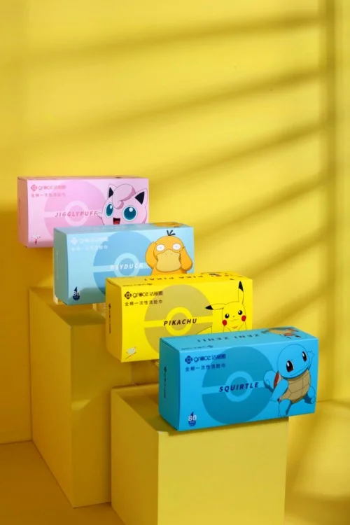 这款洗脸巾新品最大的亮点之一就是包装十分炫酷,皮卡丘、杰尼龟等备受小伙伴们喜爱的卡通形象,出现在了包装设计中,承载了满满的童心,这不单单是一件实用的日用品,更是一件精美的艺术品!
