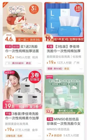 比如有的洗脸巾价格可以做到7分钱一张,而大多在每片一两毛之间不等,贵一些的单片价格0.5元-1元之间的。一旦换算成单包价格或者整箱囤货,价格更低廉,但也远远比毛巾价格贵,却在市场中大受欢迎。