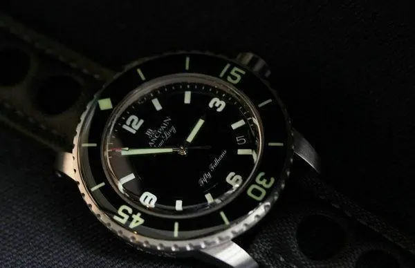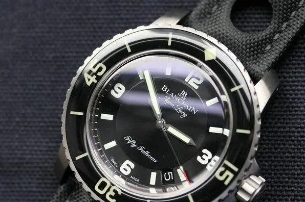 宝珀的夜光设计的惹眼,很多潜水表迷都是冲着它的夜光取得。此表夜光亮点是在表盘外的表圈上,被戏称为“黏上去的夜光技术”。Fifty Fathoms限量表用的就是这项技术,就是将不同材质、不同硬度、不同受热的刚表圈、荧光刻度和蓝宝石水晶黏合一起,组成了这幽黑中的一道靓丽风景。