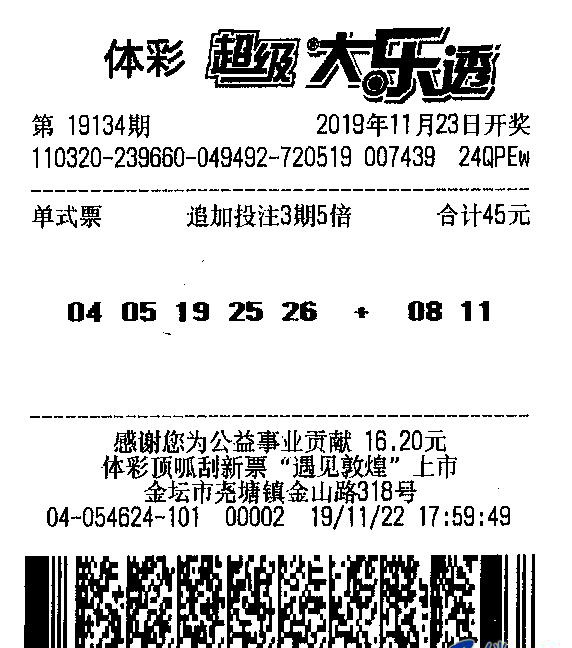 仔细查看他的中奖票,是一张投注了3期的5倍追加单式票,在11月22日17点多购于常州3204054624体彩网点。票面仅一注号码“04、05、19、25、26+08、11”,与第19135期大乐透开奖号码相差后区一个数字,因此中得5注追加二等奖,奖金总计4901225元。谈及购彩过程,吴先生表示,为了图省事,他通常一个星期买一次大乐透,多期投注对他来讲很方便。这注号码,他守了有一年多了,一直都没换。至于追加,他认为这是大乐透的特色,当然不能错过。此前吴先生也曾经中过千元的奖金,百万级大奖还是第一次。关于得知中奖时的心情,吴先生这样说,“我是用手机查到,那一刻感觉比自己想象的要平静。”