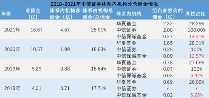 2018年-2021年,华夏基金给到的所有券商分仓佣金中,中信证券的席位占比常年位于第一,分别是26.09%、27.66%、28.31%、28.29%;而在中信保诚基金的券商分仓佣金中,这一数据分别为5.25%、5.92%、12.57%、14.41%。
