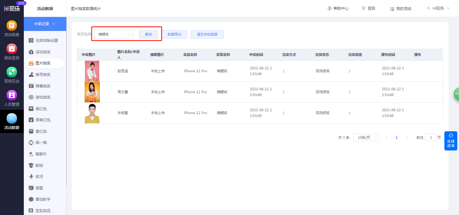 通过“活动数据”——“中奖记录”——选择奖品名称,可查看本轮中奖数据