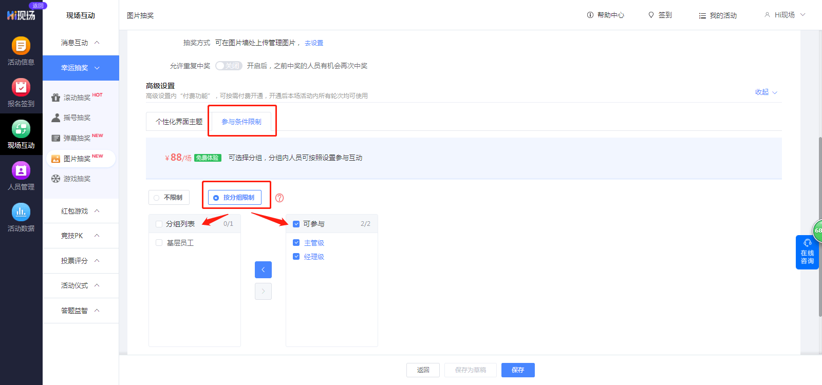 如需限定仅允许或禁止部分图片参与抽奖,可开通参与条件限制,并提前在图片墙中,对所有图片进行设置分组,在此进行分组管理: