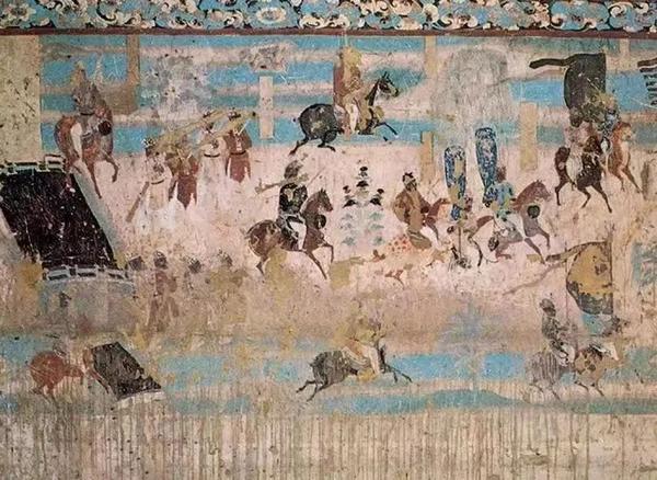 张议潮统军出行图(局部)莫高窟第 156 窟(图©段文杰主编《敦煌石窟全集》)▼
