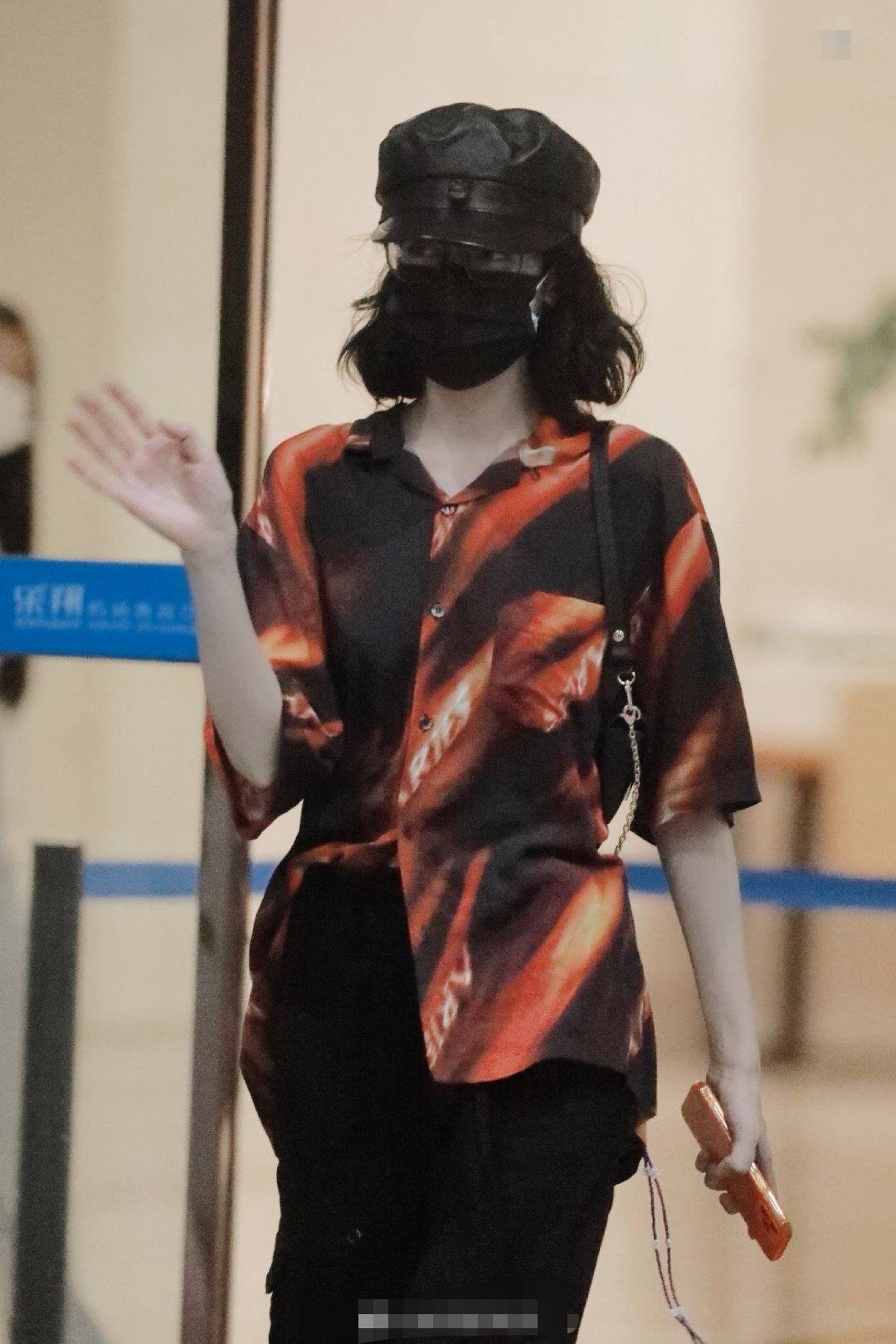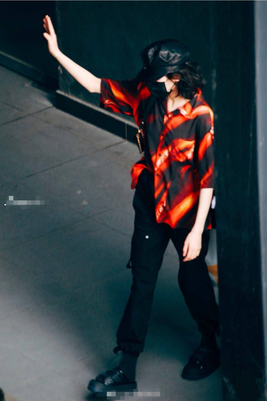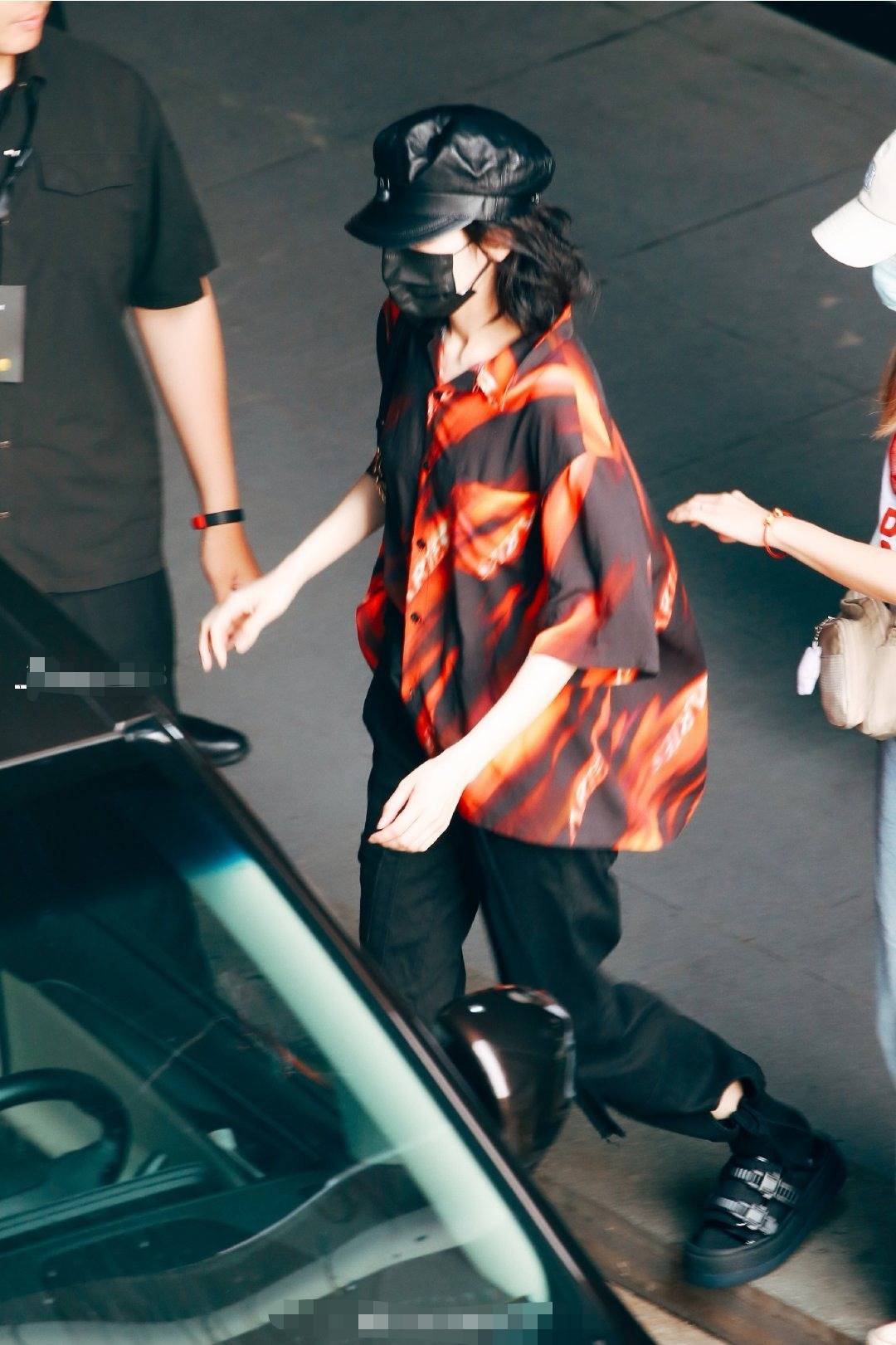 迪丽热巴机场穿搭,穿火焰衬衫配工装裤,网友:妥妥帅气男明星!-迪丽热巴服饰搭配图片