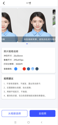 这里基本上所有的模板在使用前都会提供详细的规格信息说明,实际尺寸、像素尺寸、分辨率(也就是常说的画质)都会详细说明,还贴心的提供了详细的拍照建议,按照建议拍摄,可以让后续编辑制作出来的证件照片有着天然上的优势。