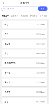 软件有着相当简洁清爽的界面设计,方便的用户进行功能找寻,像是基础的一寸、两寸可以直接桌面跳转,如果需要更加详细完善的证件模板可以选择“更多规格”来进行查看。
