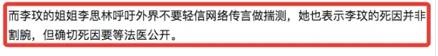 “李玟并非割腕,希望外界不要胡乱猜测,确切死因要等法医公开。”