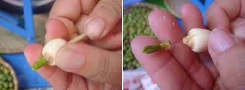 用莲子芯泡茶可以选用新鲜莲子心,也可以选用制作好的干燥莲子心。新鲜的莲子心一般需要用刀在莲子中间横划一圈,掰开莲子,再用牙签从莲子中间穿过,带出莲子心即可。干燥的莲子心一般选取大小一致、无杂质的。