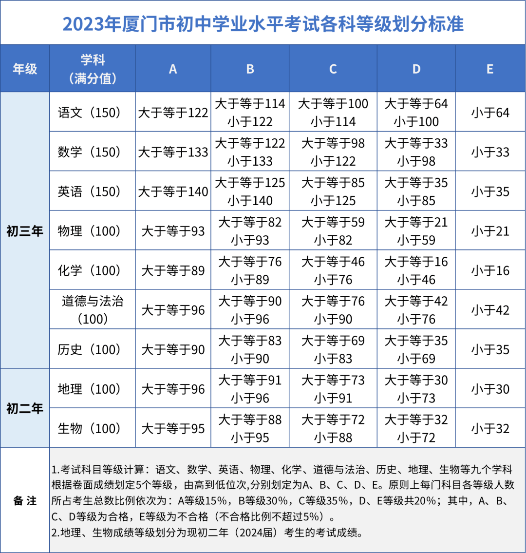 2023年厦门市初中学业水平考试 (简称“中考”)初三考生成绩已经公布,经市中招领导小组研究同意,今年中考各科等级划分标准如下(点击图片放大查看):