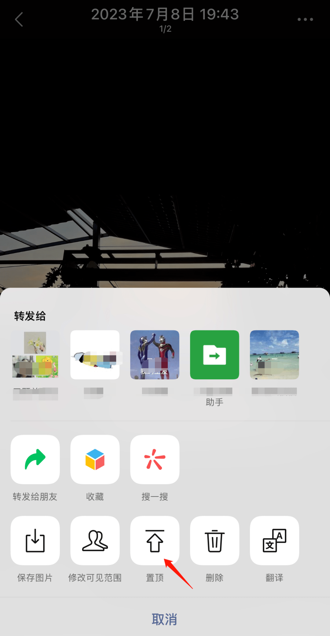 如图所示,用户选中一条需要置顶的朋友圈,然后点击右上角的“...”,此时在“修改可见范围”右方就会出现“置顶”选项。
