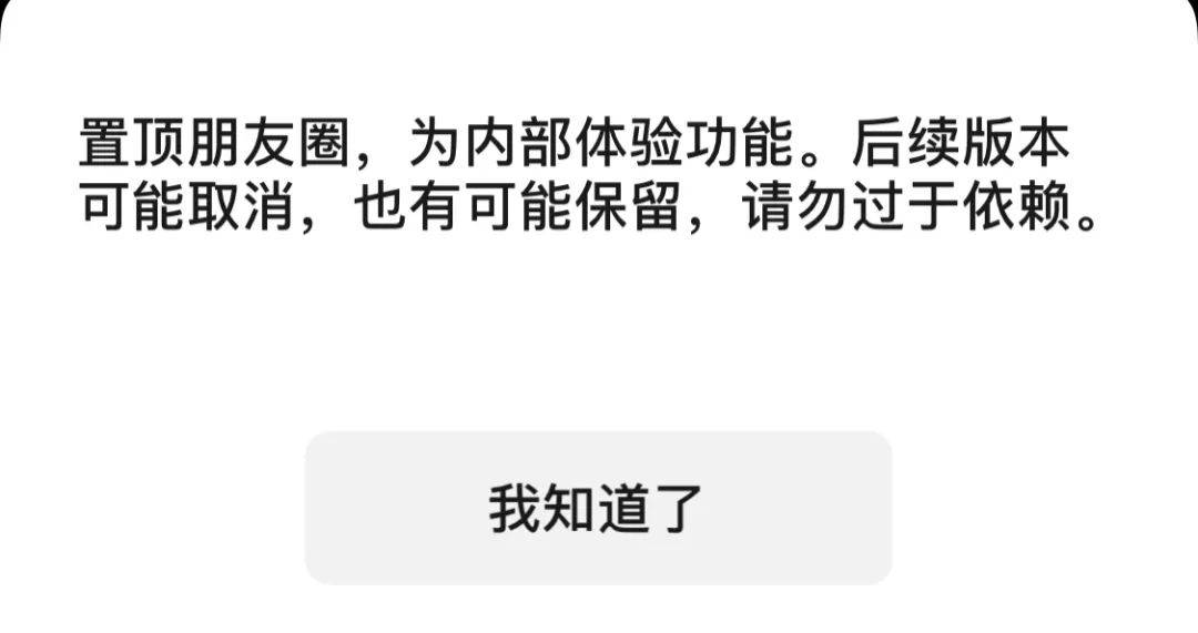 微信还提醒:置顶朋友圈为内部体验功能,后续版本可能会取消,也可能会保留,请勿过于依赖。
