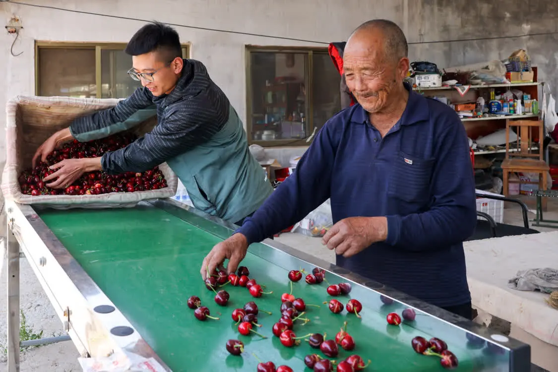 5月31日,燕崖镇果农王贵金和爷爷使用机器分拣刚采摘的樱桃。新华社记者 朱峥 摄