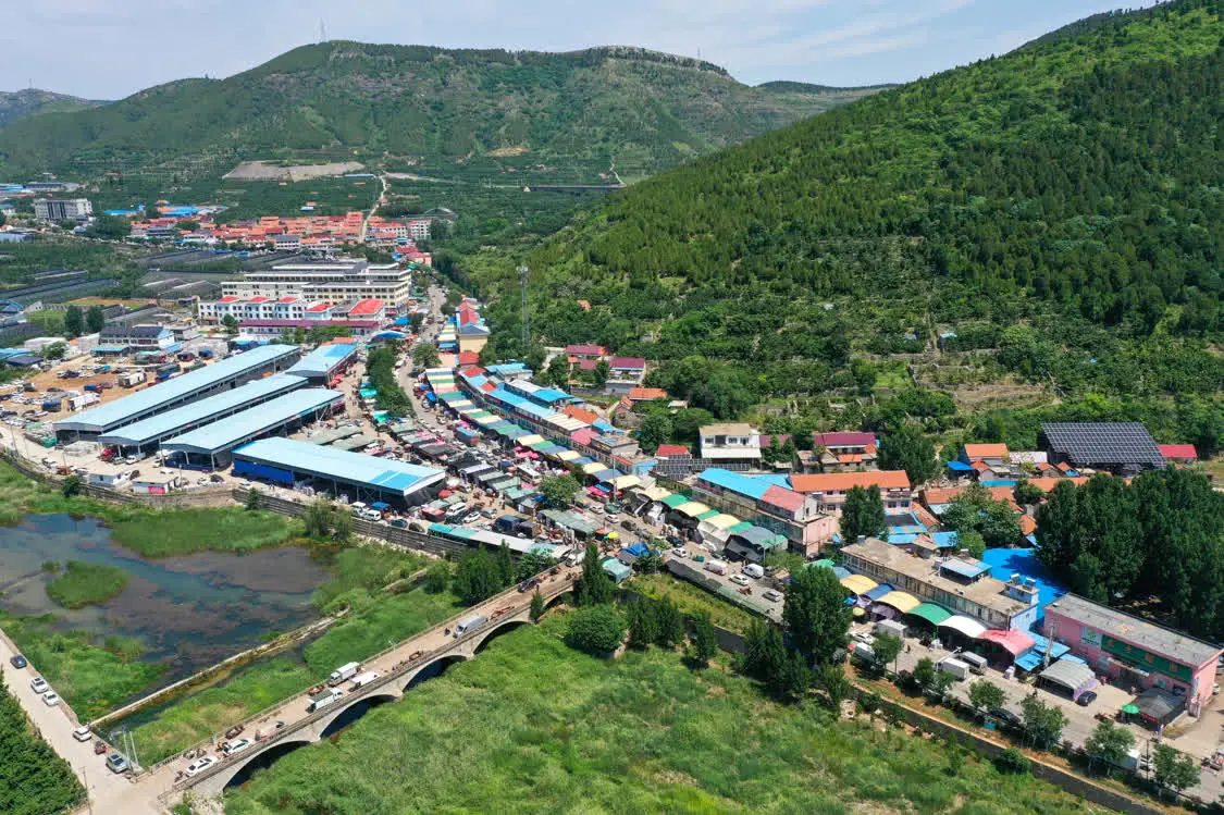 俯瞰燕崖镇樱桃交易市场(5月31日摄,无人机照片)。新华社记者 朱峥 摄