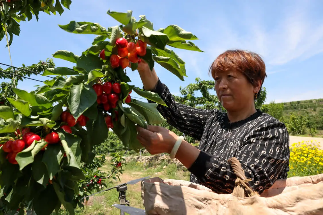 5月31日,燕崖镇果农张广花在采摘樱桃。她家种植了1600株樱桃树,去年销售额40多万元。新华社记者 朱峥 摄