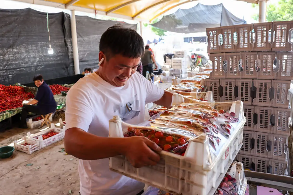 5月31日,来自安徽的客商卜九峰在燕崖镇樱桃交易市场内搬运樱桃。新华社记者 朱峥 摄