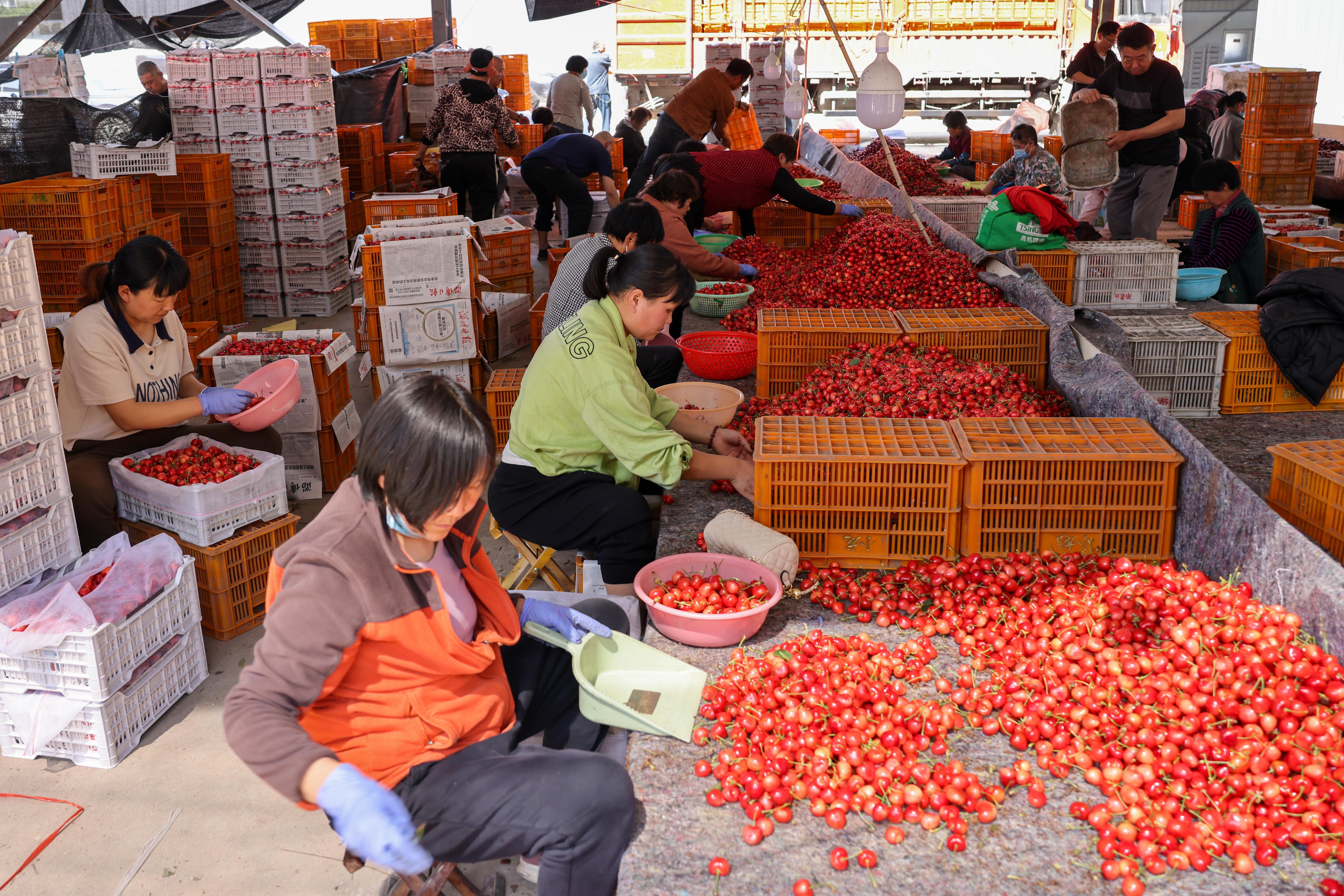 5月31日,燕崖镇樱桃交易市场内务工人员在分拣收购的樱桃。新华社记者 朱峥 摄