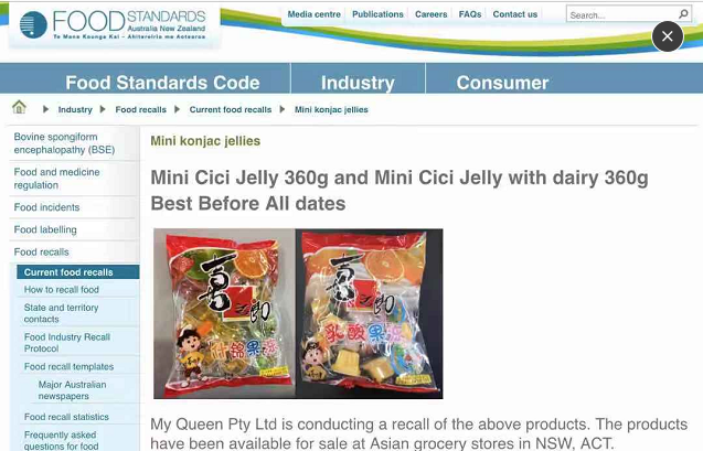 而早在11月15日,澳新食品标准局(Food Standards Australia New Zealand)在其官网发布信息显示,名为My Queen Pty Ltd 的公司正对原产地为中国的360克装喜之郎什锦果冻和360克装喜之郎乳酸果冻发起召回,召回的原因也是有关蒟蒻果冻存在“窒息危险”,称若食用含有蒟蒻的果冻食品,可能会引起窒息。