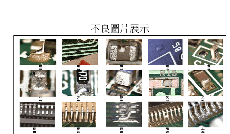 1.空焊——零件脚或引线脚与锡垫间没有锡或其它因素造成没有接合。
