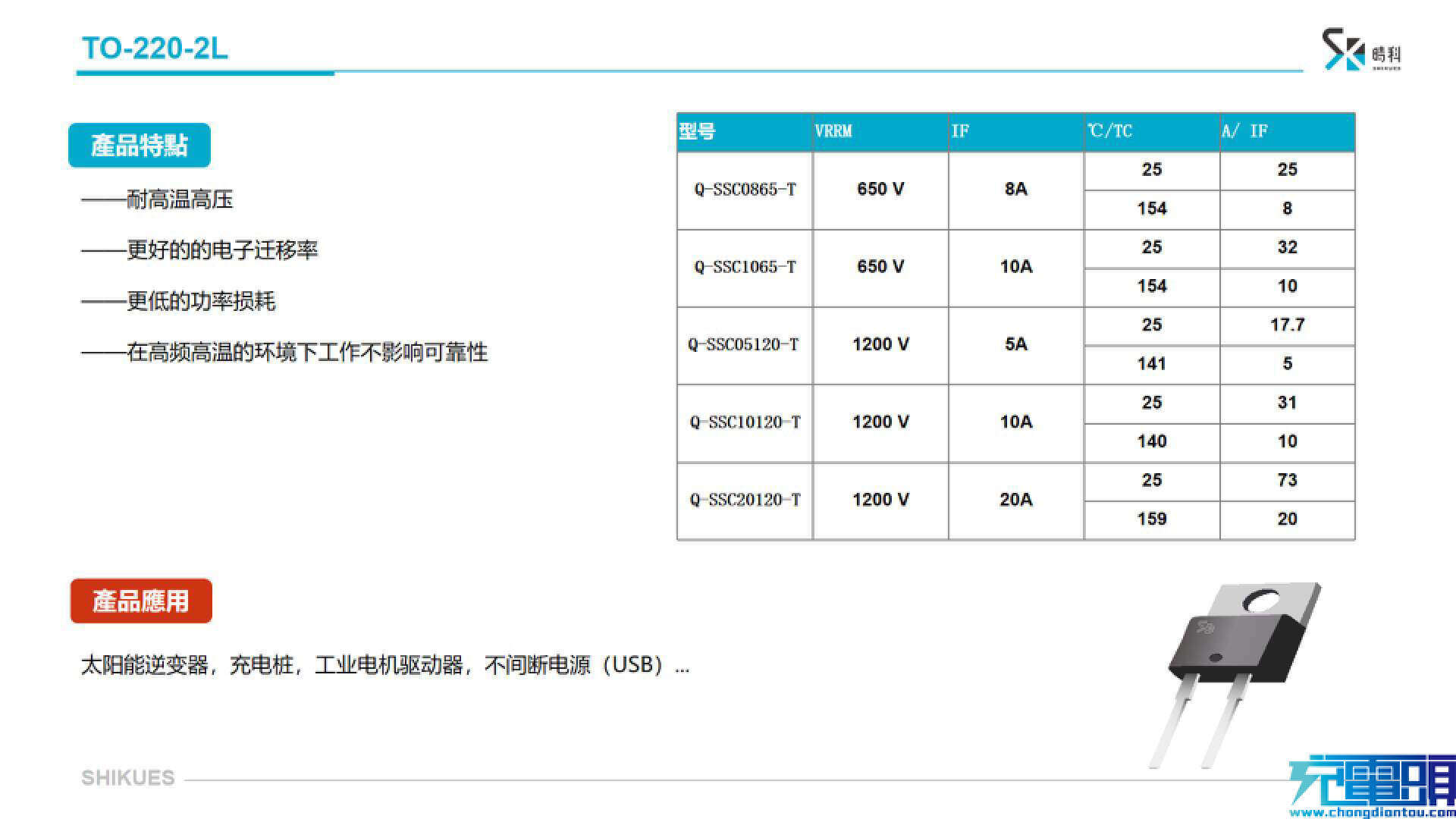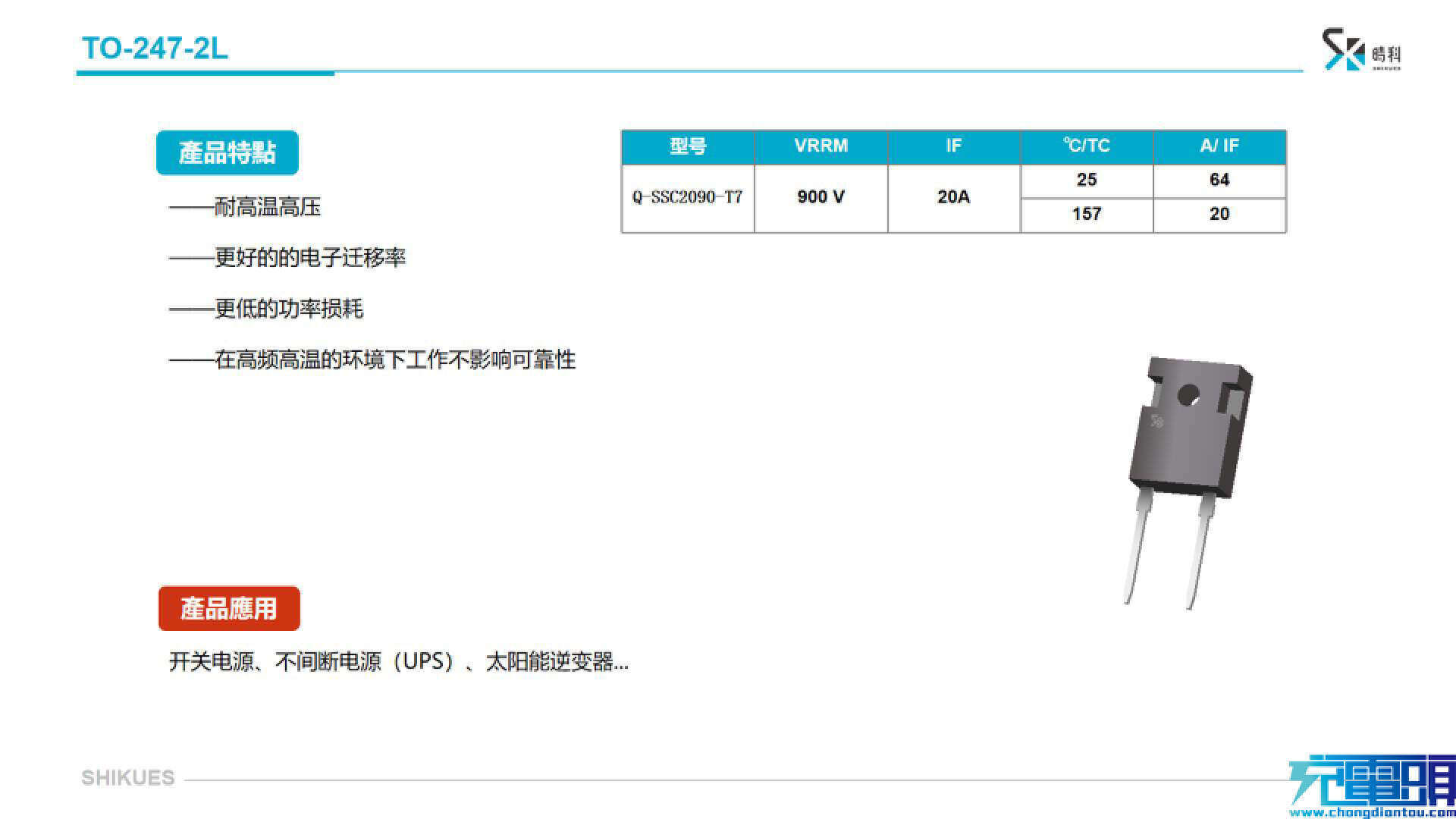 最后是TO-247-2L封装,提供900V耐压,20A电流器件,可用于开关电源,不间断电源和太阳能逆变器。時科产品具有耐高温高压,更好的电子迁移率,更低的功率损耗,在高频高温的环境中工作不影响可靠性的特性。