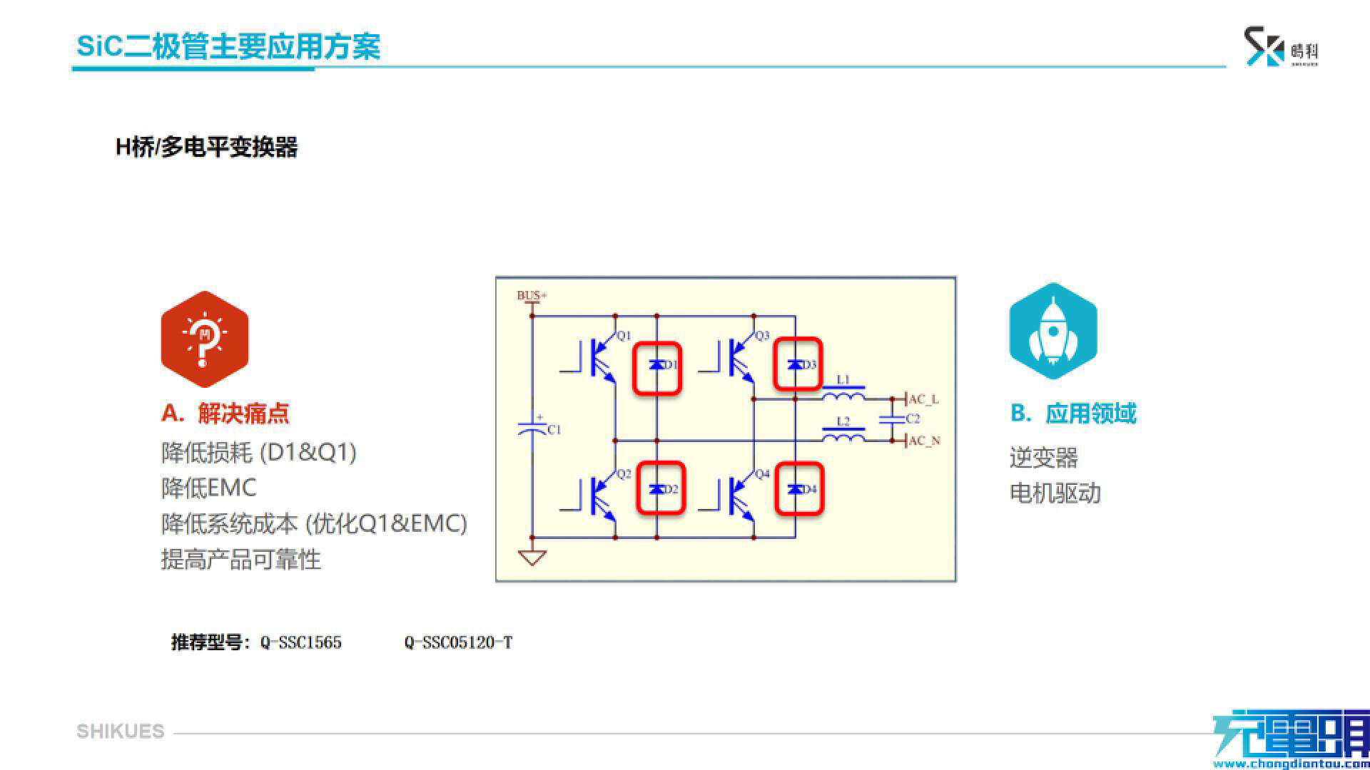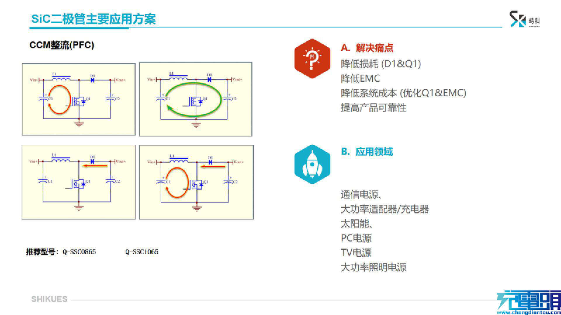 首先介绍的是CCM PFC整流,碳化硅二极管可以消除快恢复二极管反向恢复时间带来的损耗,降低开关管和整流管的损耗,降低EMC,降低系统成本,提升产品可靠性。時科推荐使用Q-SSC0865和Q-SSC1065碳化硅二极管。这部分应用的领域有通信电源,大功率适配器/充电器,太阳能,PC电源,TV电源和大功率照明电源。