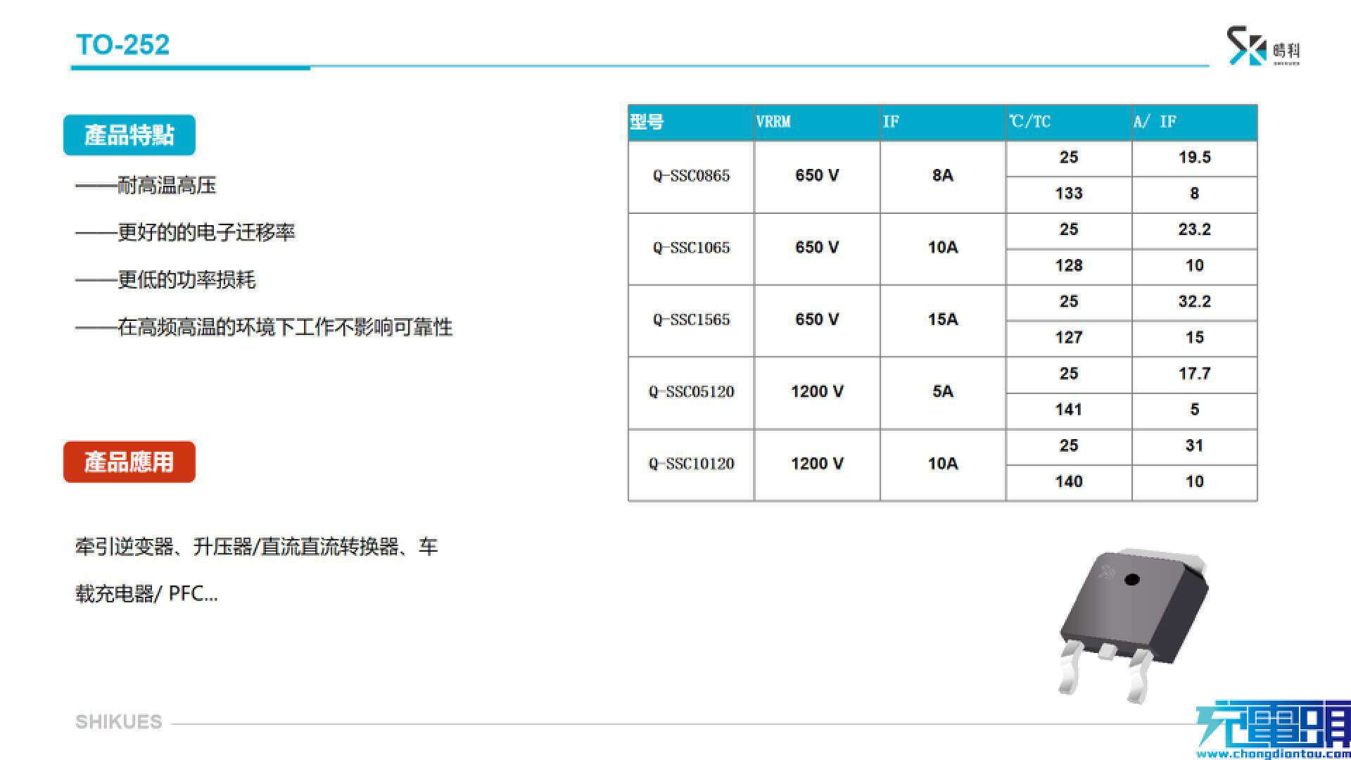 首先介绍的是TO-252封装,提供650V耐压,8A,10A和15A,1200V耐压,5A,10A的设计,可应用于牵引逆变器,升压器/直流直流转换器,车载充电器/PFC等。