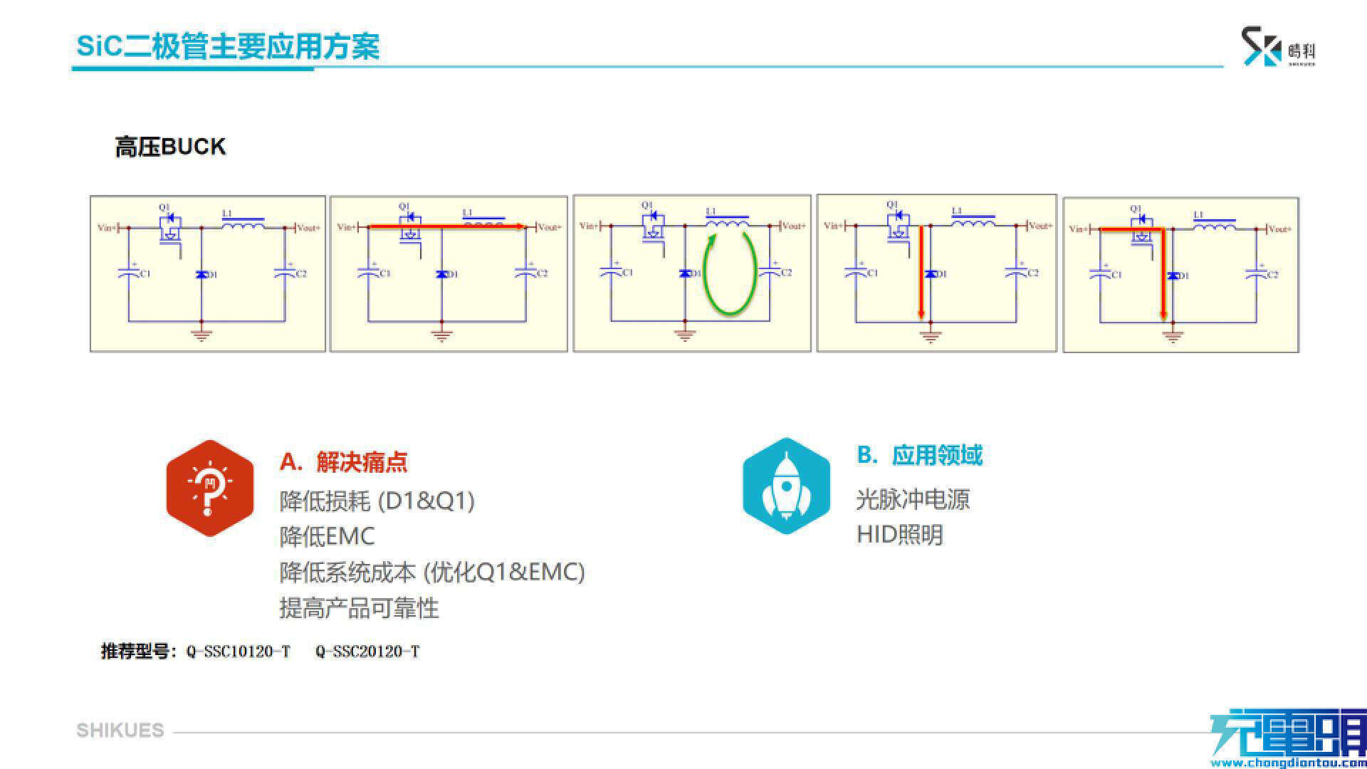 最后带来的是高压BUCK电路的应用,高压BUCK对快恢复二极管的要求非常高,推荐使用碳化硅二极管,消除反向恢复时间带来的损耗,降低EMC,降低系统的成本并提高整体可靠性。适合用于光脉冲电源和HID照明。時科推荐使用Q-SSC10120-T和Q-SSC20120-T碳化硅二极管。