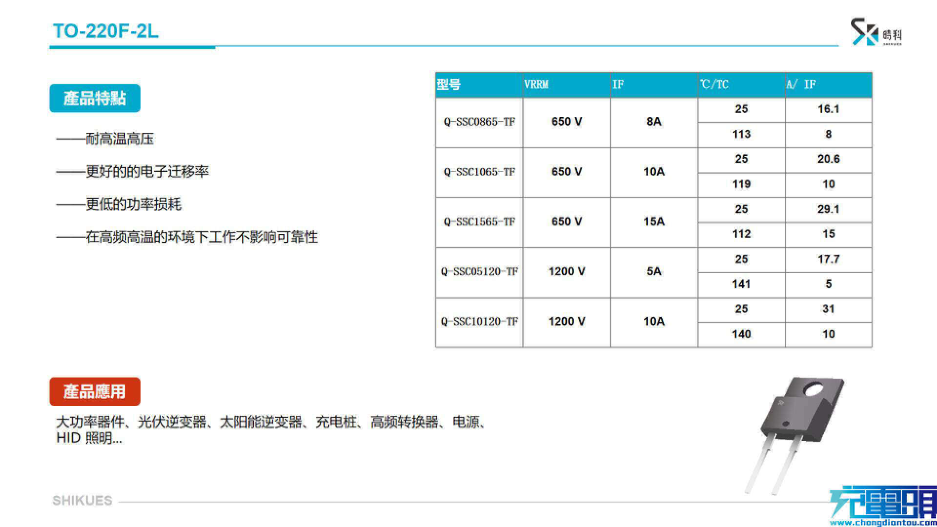 接下来介绍的是TO-220F-2L封装,提供650V耐压,8A,10A和15A,1200V耐压,5A,10A的设计,可应用到大功率器件、光伏逆变器、太阳能逆变器、充电桩、高频转换器、电源和HID照明等。