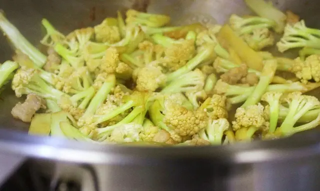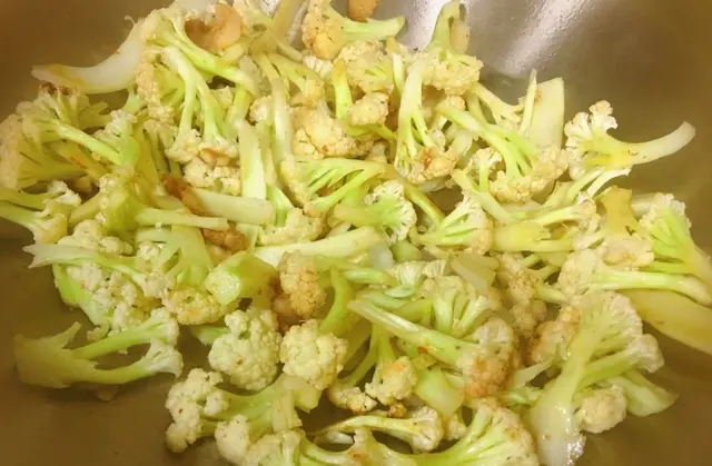 1、一定要炒干锅出油,哪怕是没煮干水也要开锅盖炒干,这样就能让花菜吸干水分,渗出油会非常入味;