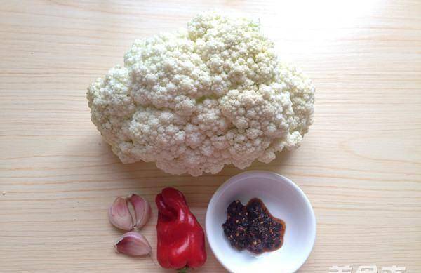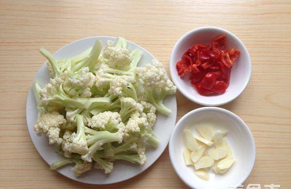 把洗净的花菜切成小朵,大蒜切片,红椒切小块