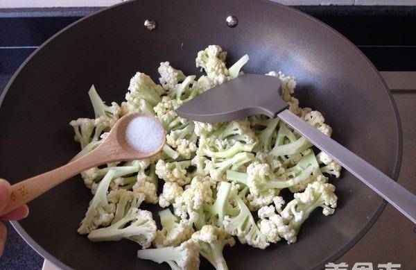 下入花菜和1克盐翻炒片刻后转小火煸炒