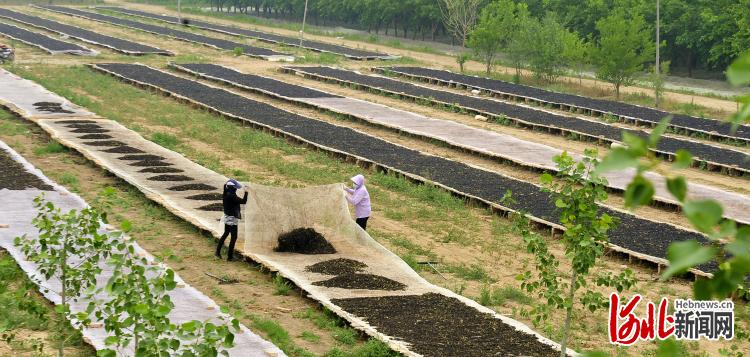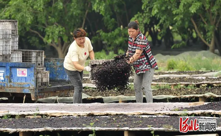 2021年6月9日,在泊头市一家桑葚种植基地,工人正在晾晒桑葚。通讯员苑立伟摄影报道
