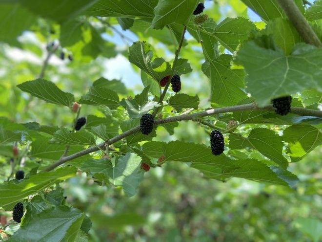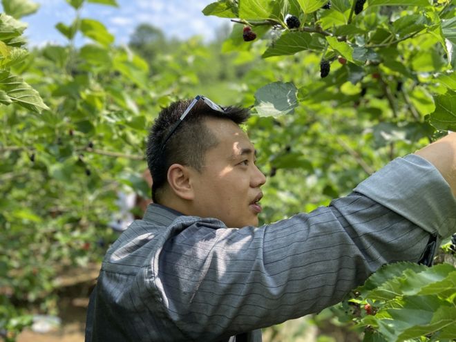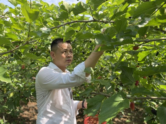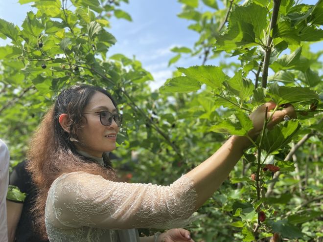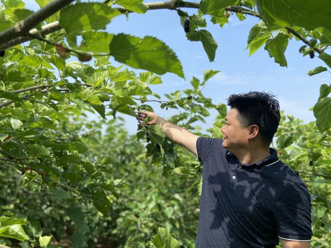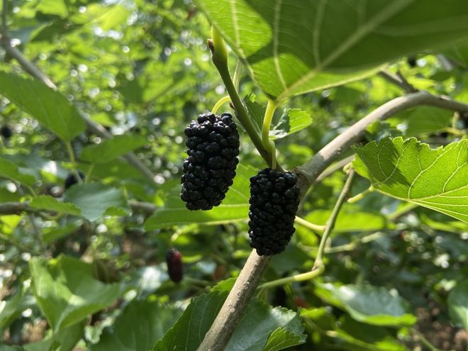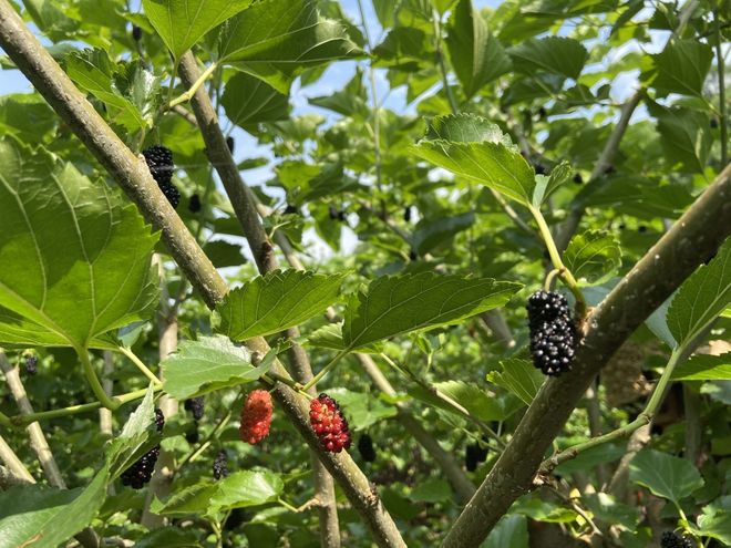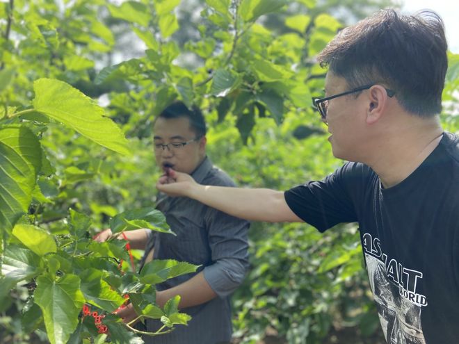 下午,考察团参观了酒庄的桑葚种植基地。初夏时节,一排排翠绿色的桑树叶子在微风中摇曳,一串串紫色的桑葚犹如一颗颗宝石,在绿色的树枝中若隐若现。秦岭山下清爽的微风让人心旷神怡。总经理郭科说道,桑葚种植要根据特性因地制宜,机械化的精细程度也会有所不同,科学管理才能种植出高品质的酿酒桑葚。