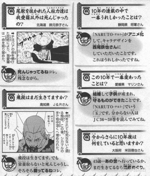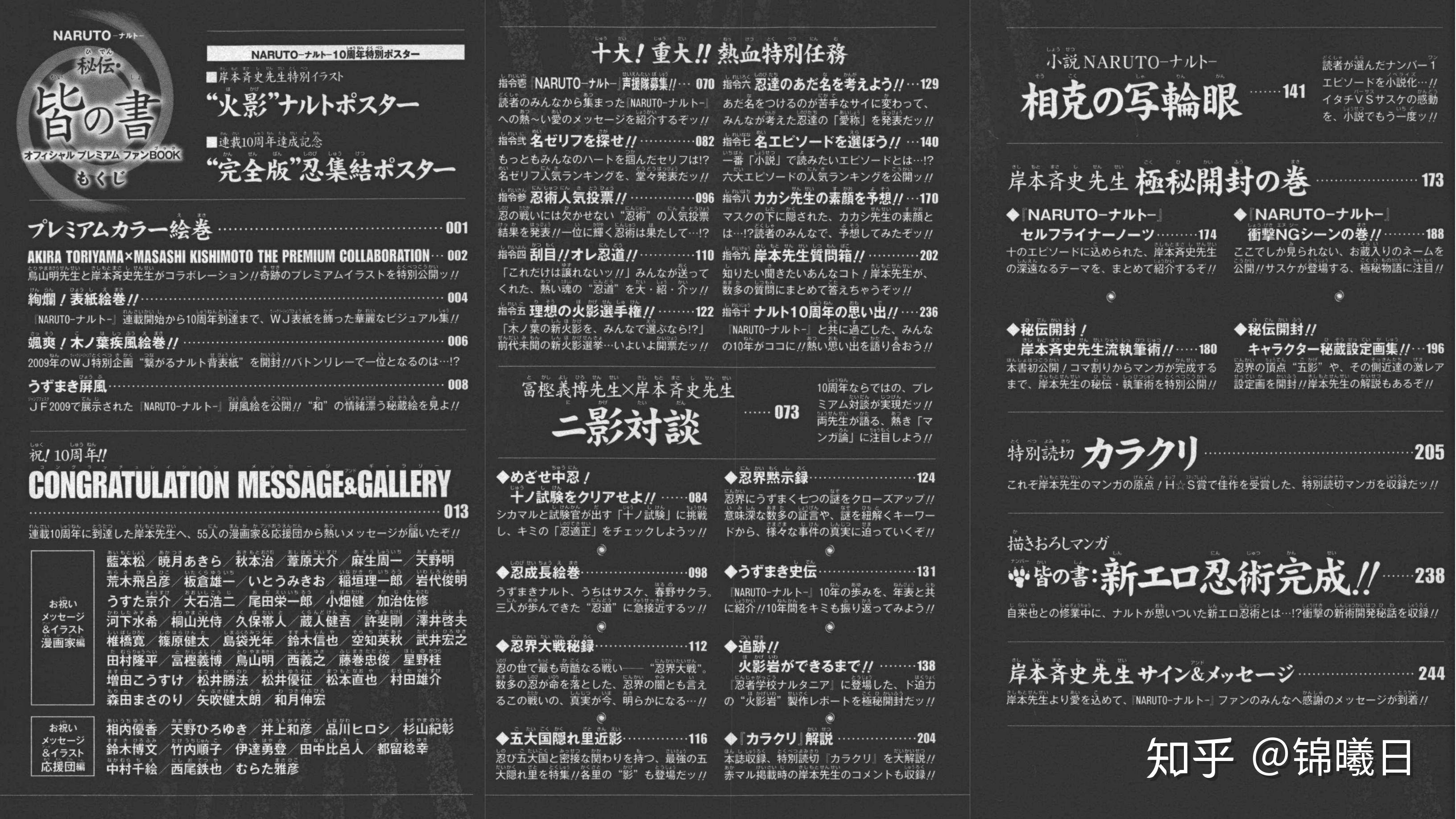 各路大神的庆贺,算是《皆之书》最大的特色了。此外其中还有岸本齐史和富坚义博的对谈内容,这里也不再过多展示。而关于《火影忍者》的相关内容除了记载忍者五大国国力情况和记载事件的忍界默示录外就只有一些设定手稿和采访内容了,其中关于飞段生死的问题在这里也有了回答。
